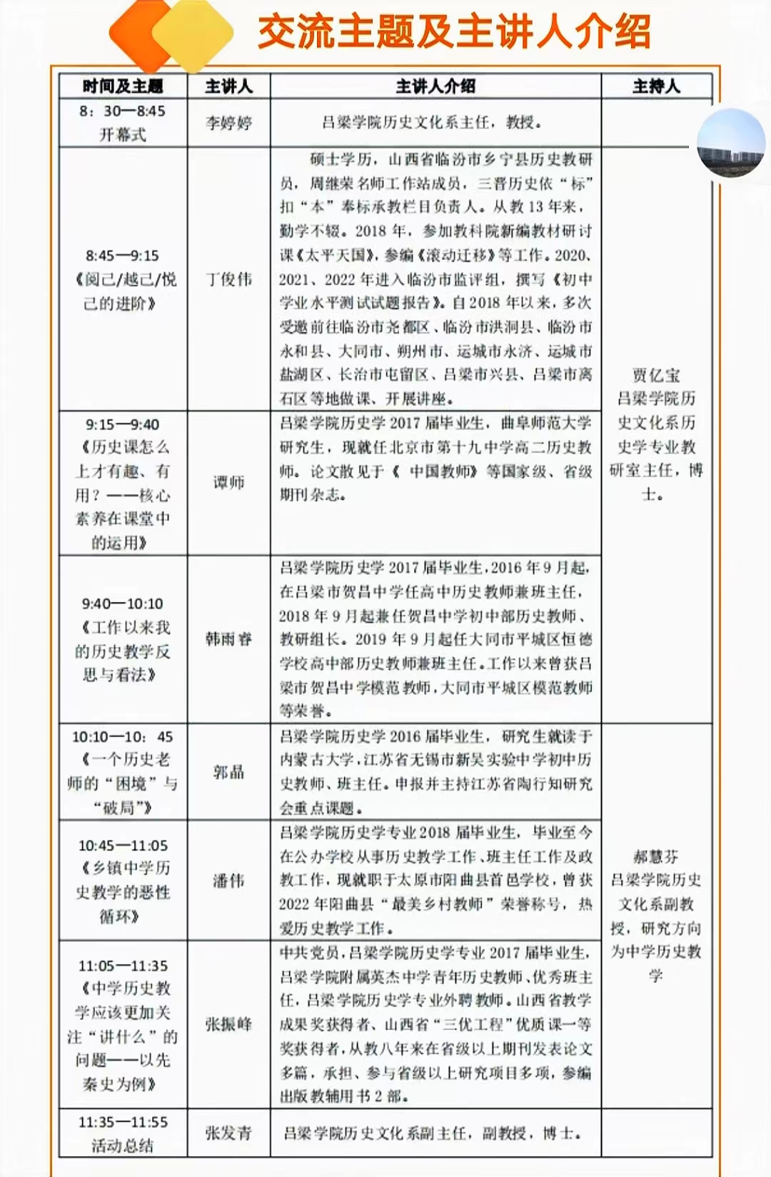 系主任李婷婷教授对本次进行成长汇报交流的毕业生表达了欢迎与感谢。本次活动在我系迎接新一轮教育部师范类专业认证的大背景下筹划开展,也是我系积极响应太阳集团“卓越理工—特色文科—精湛艺体—优等师范”学科布局下的体现;更是我系积极探索新时代师范类专业育人模式的交流实践。当下适逢新课改不断推进,新课标、新教材和新高(中)考对中学历史教学提出了诸多新要求。中学历史教学应怎样更好满足新时代学生需求,中学历史教育应如何守正创新,青年历史教师应树立什么样的职业理想,如何更好更快地实现职业发展……,都是高校师范类专业亟需正视和破解的问题。六位主讲教师从空间上看有南、有北;从身份上看有一线新秀、有教研室教研员;从任职学校性质看有公办学校、有民办学校;从任职学校的地域看有一线城市、有乡镇中学……虽然在不同地域、不同学情、不同理念和不同教学设计中存在差异,但在学科属性和职业规范上具有同一性,拥有丰富的交流话题和广阔的研讨空间。毕业生的分享,旁征博引,精彩纷呈,有理论引领、有实践借鉴;有学科思考、有育人路径;有学科素养渗透、有专业知识论证。既全面体现了我系历史学专业作为师范类专业的人才培养成绩,又高效地为在校学生提升职业认知水平、夯实职业成长基础做出了引领,出色地实现了活动的预期目标,得到与会教师学生的一致好评。(图3)