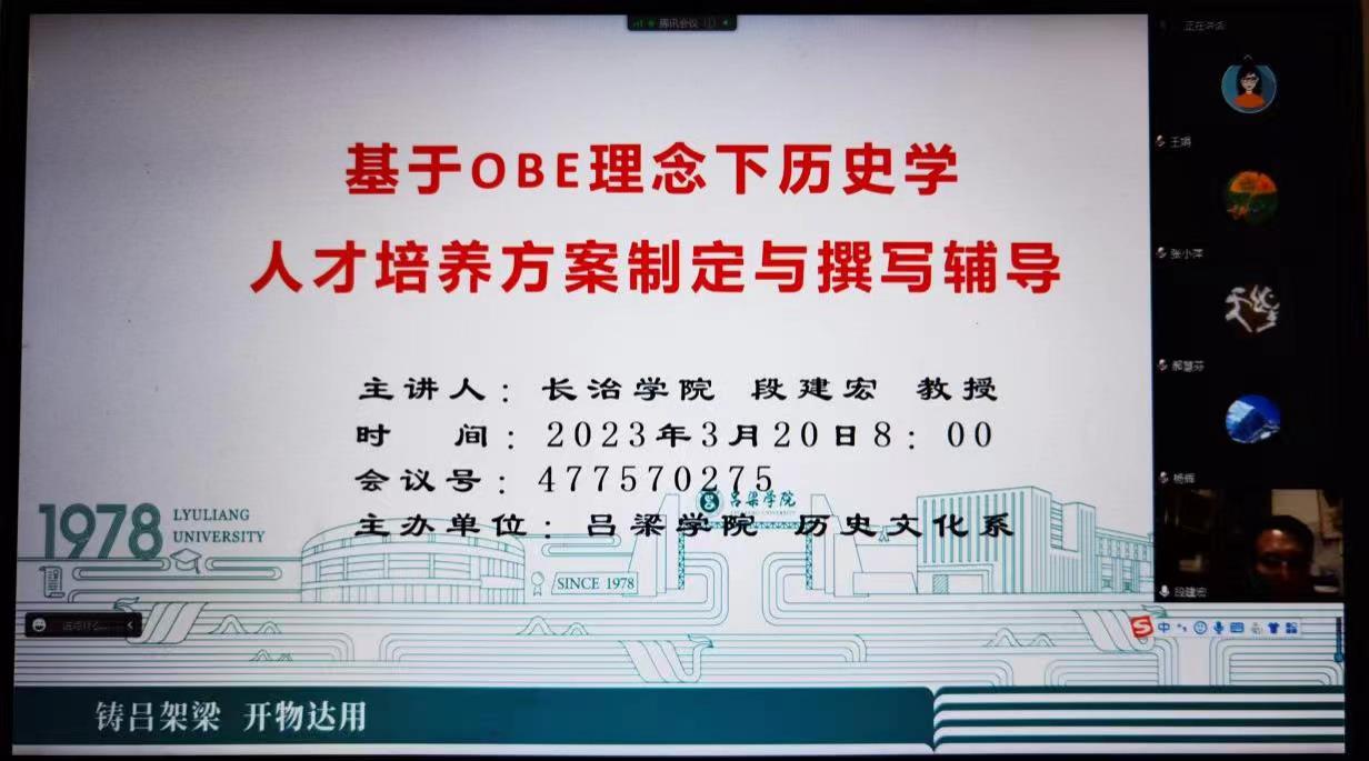 2023年3月20日20:00,太阳成集团tyc234cc特邀请长治学院历史与旅游管理系主任段建宏教授进行了线上专题辅导,以进一步修订与完善历史学2021版人才培养方案,提高历史学专业师范教育质量水平。讲座由系主任李婷婷老师主持,系教学副主任张小萍老师及各教研室主任、专业带头人参加本次指导。