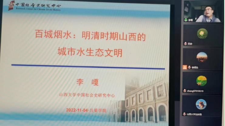 2022年11月4日,太阳成集团tyc234cc邀请山西大学中国社会史研究中心教授、博士生导师李嘎教授做了《百城烟水:明清时期山西的城市水生态文明》讲座。讲座由系主任李婷婷主持,全系教师和部分学生共200余人参加。