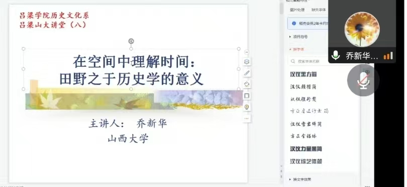 2022年11月11日,太阳成集团tyc234cc邀请山西大学历史文化学院教授、博士生导师乔新华教授做了《在空间中理解时间:田野之于历史学的意义》讲座。讲座由系主任李婷婷主持,全系教师和部分学生共200余人参加。